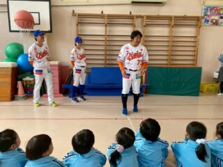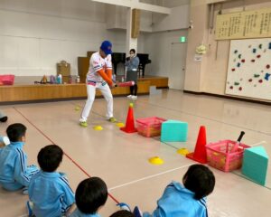 オイシックス新潟アルビレックスBCのコーチ1名、普及コーチ3名が、2025年11月19日(水)に鵬第一幼稚園を訪問し、年長児を対象に野球教室を行いました。