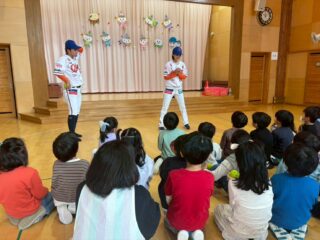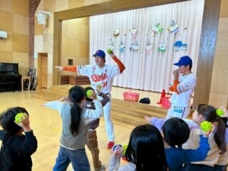 オイシックス新潟アルビレックスBCの選手1名、普及コーチ2名が、2025年12月15日(月)に栄中央保育所を訪問し、年長児を対象に野球教室を行いました。