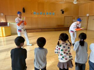 オイシックス新潟アルビレックスBCの選手1名、普及コーチ2名が、2025年12月16日(火)に新潟市立和納保育園を訪問し、年長児を対象に野球教室を行いました。