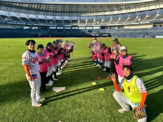 当日は、選手2名、普及コーチ2名が参加し、基本動作指導やキャッチボール、バッティング指導、ミニゲームなどを通じて、交流の時間を過ごしました。