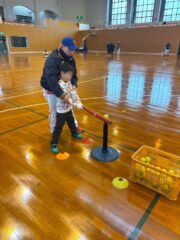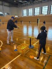 当日は、選手2名と普及コーチ2名が参加し、基本動作指導やボールの投げ方、バッティング、ミニゲームなどを通じて、子どもたちと交流の時間を過ごしました。