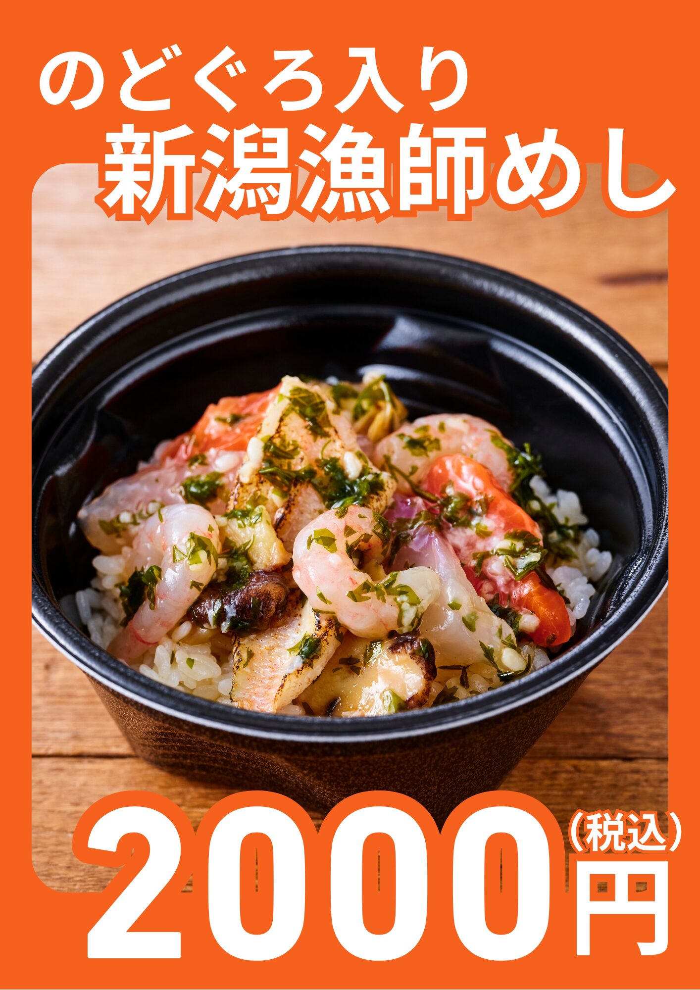 新潟の豊かな海が育んだ、選りすぐりの海の幸を贅沢に盛り込んだ一杯です。 香ばしく炙った新潟産「のどぐろ」、佐渡産の「さくらます」をはじめ、 県産の「鯛」「南蛮えび」「さざえ」「ながも」をふんだんに使用しました。 素材の旨みを最大限に引き出した、新潟の誇る逸品を、スタジアムでお楽しみください。 数量限定でのご用意となりますので、ぜひお早めにお求めください。