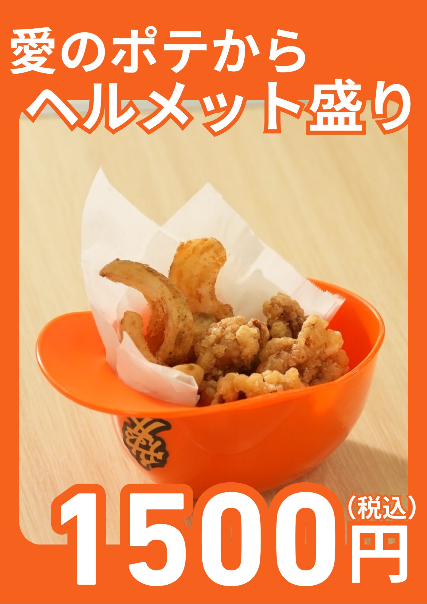 オイポテとオイからをヘルメット型容器に持った一品。オリジナルの「愛」のヘルメット型カップはお持ち帰りいただけます。 ・酒粕チーズトッピング(+100円)