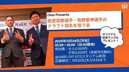 オイシックス新潟アルビレックスBCは、「Oisix Presents 能登嵩都選手・牧野憲伸選手のドラフト指名を祝う会」を開催することとなりましたので、お知らせ致します。