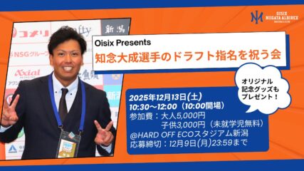 オイシックス新潟アルビレックスBCは、「Oisix Presents 知念大成選手のドラフト指名を祝う会」を開催することとなりましたので、お知らせ致します。