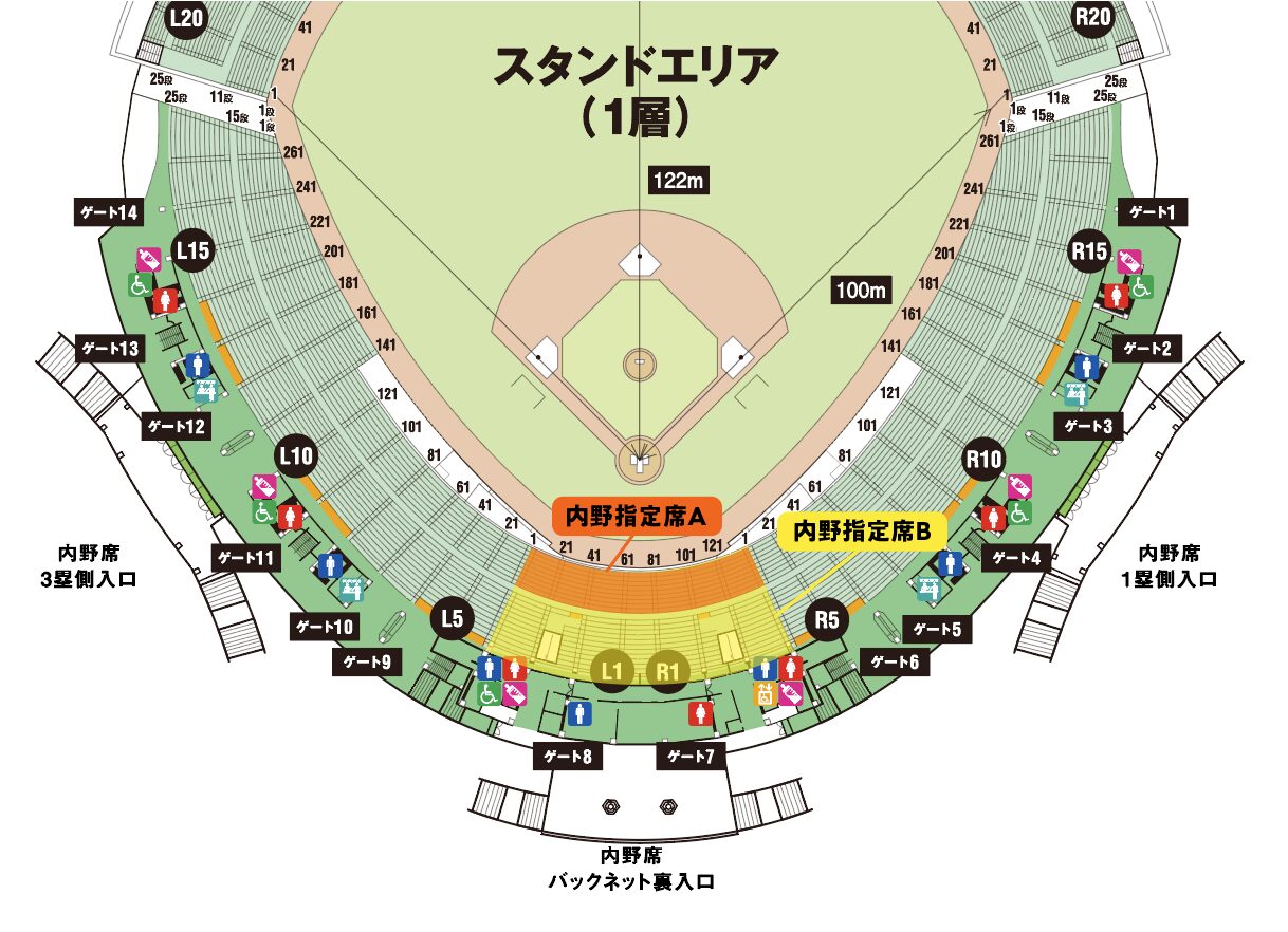 内野バックネット裏、内野1塁側、内野3塁側の全席より、お好みのお席をお選びいただけます。