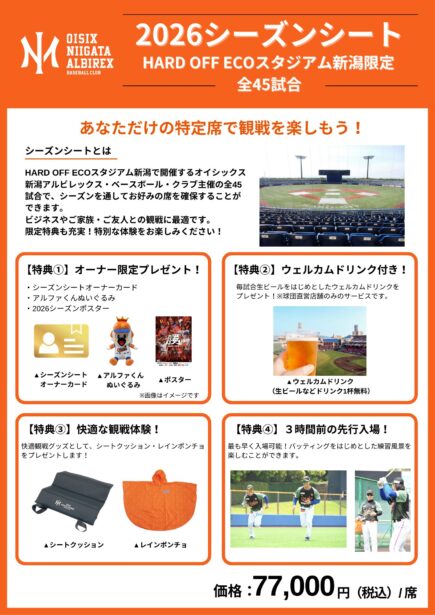 オイシックス新潟アルビレックス・ベースボール・クラブは、2026シーズンのHARD OFF ECOスタジアム新潟(以下、エコスタ)で行われるファーム・リーグ 東地区 公式戦/ファーム・リーグ 交流戦のシーズンシートを販売いたします。