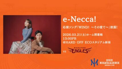 オイシックス新潟アルビレックス・ベースボール・クラブは、3月21日(土)のホーム開幕戦にて、応援ソング「WINd! ~その愛で~」を作成されたe-Necca!のお二人にご出演頂くことが決定しましたのでお知らせ致します。