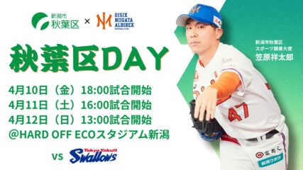 オイシックス新潟アルビレックス・ベースボール・クラブは4月10日(金)・11日(土)・12日(日)の東京ヤクルトスワローズとの3連戦を「秋葉区DAY」と題して、新潟市秋葉区の魅力を堪能できる3日間とすることをお知らせいたします。