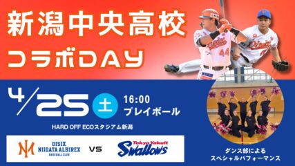 オイシックス新潟アルビレックス・ベースボール・クラブは、4月25日(土)の東京ヤクルトスワローズ戦にて、「新潟中央高校コラボDAY」を開催することをお知らせいたします。